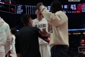 nba直播12月29日讯 今日开拓者114-108主场战胜凯尔特人,比赛中的一次暂停时朱·霍勒迪对杨瀚森进行了指导。