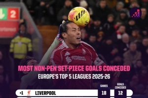 nba直播12月30日讯 Opta统计了本赛季五大联赛球队定位球的失球数量(不包括点球),并列出榜单,利物浦12球居首,这也是2015-2016赛季(15球)之后,利物浦定位球失球最多的赛季。