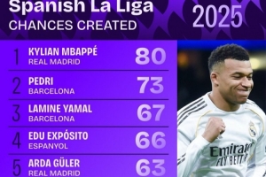 nba直播12月30日讯 2025年即将结束,数据机构squawka也统计了本年度西甲创造机会情况,姆巴佩力压佩德里居首。