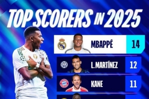 nba直播12月31日讯 皇马前锋姆巴佩在2025年打进59球,追平C罗记录,创个人年度新高。欧冠官方社媒晒出2025年欧冠射手榜,其中姆巴佩以14球排名榜首。