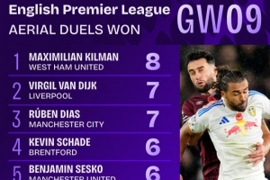 nba直播10月28日讯 英超第9轮战罢,据Squawka数据统计,西汉姆后卫基尔曼是本轮赢得空中对抗次数最多的球员,共计8次。